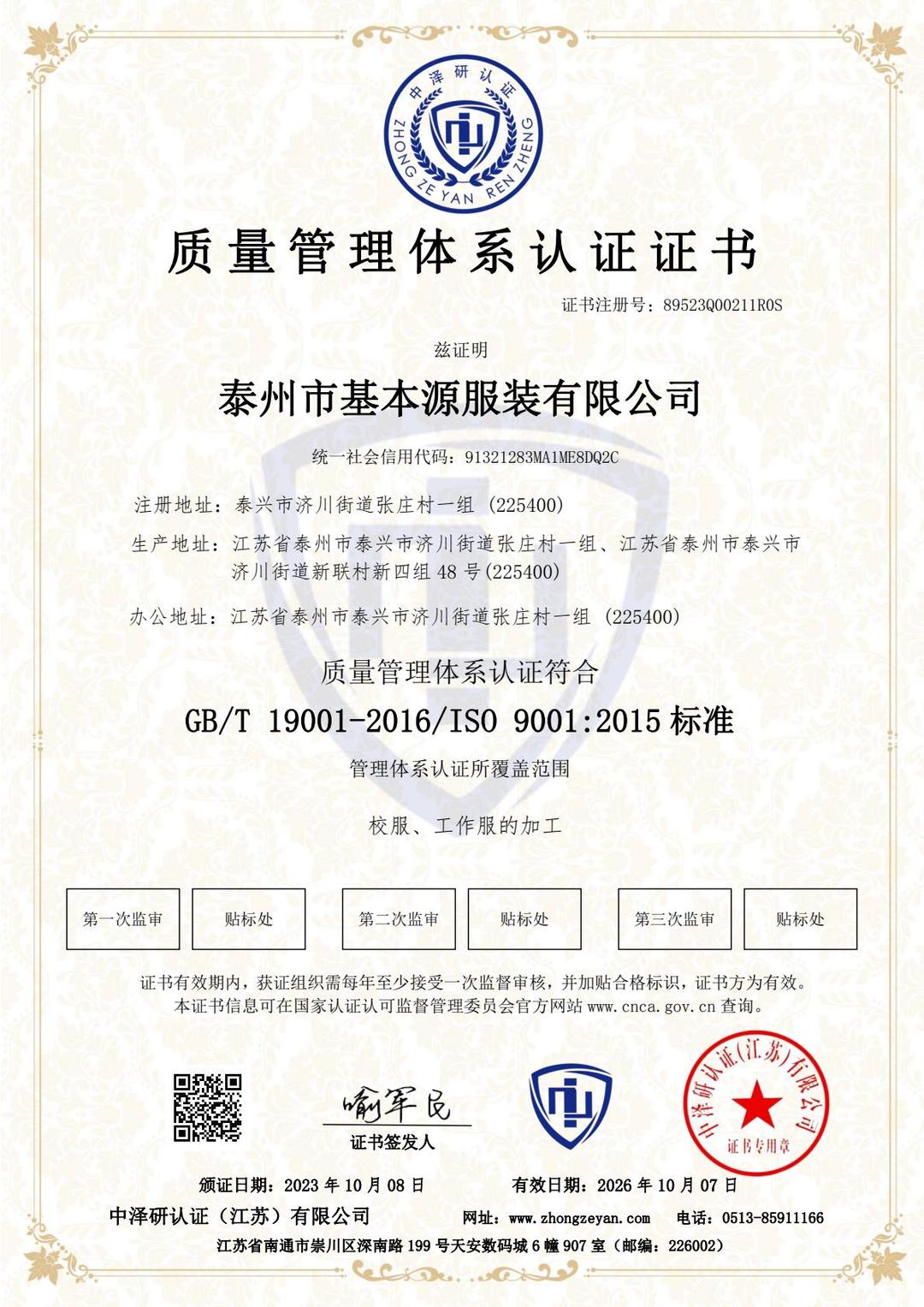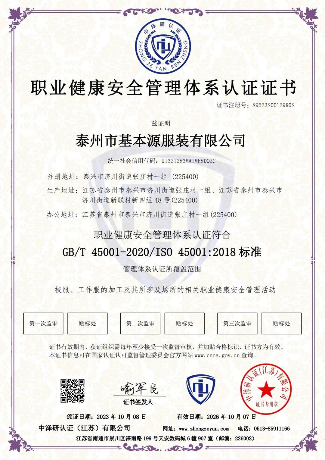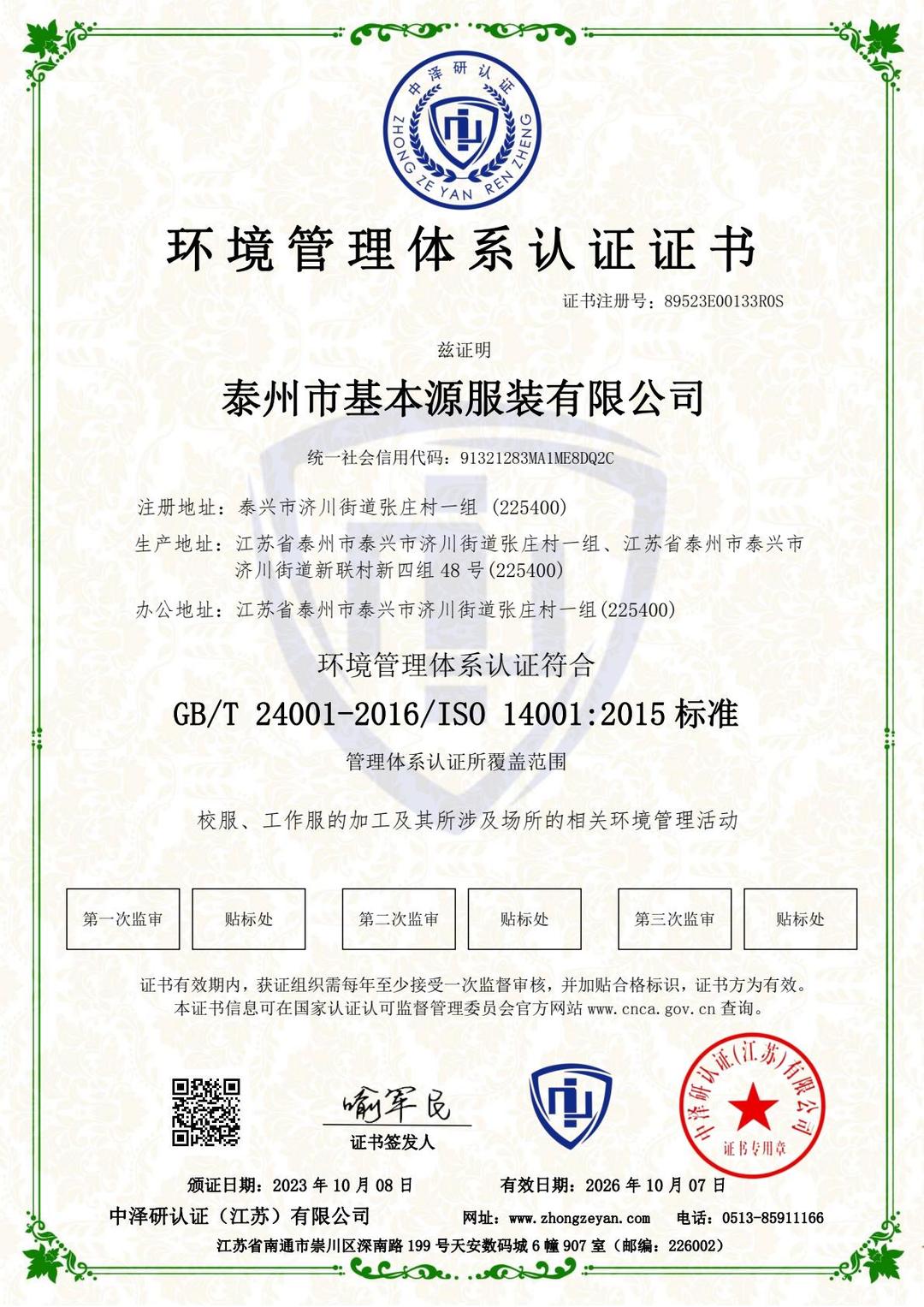 (环境管理体系认证证书、质量管理体系认证证书、职业健康安全管理体系认证证书)